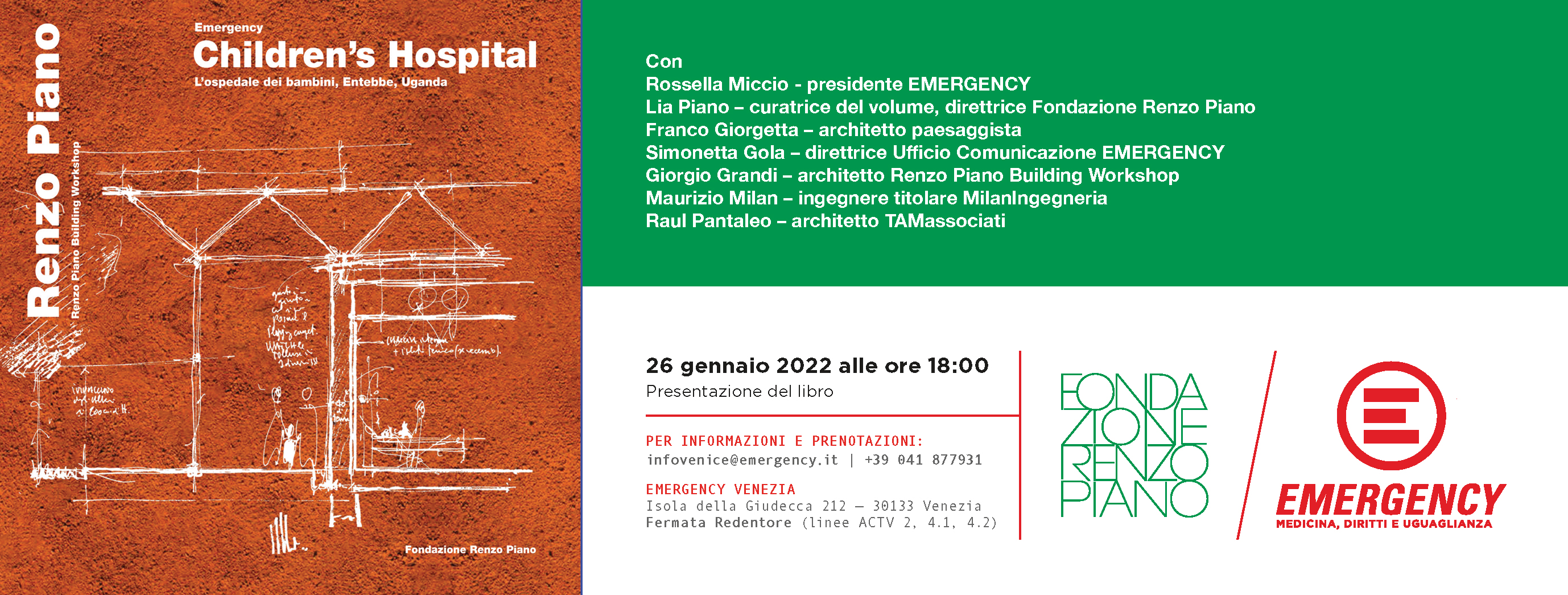 All’incontro interverranno Rossella Miccio, presidente di EMERGENCY; Lia Piano, curatrice del volume e direttrice Fondazione Renzo Piano; Simonetta Gola, direttrice Ufficio Comunicazione di EMERGENCY; Giorgio Grandi, architetto Renzo Piano Building Workshop; Maurizio Milan, ingegnere titolare MilanIngegneria e Raul Pantaleo, architetto TAMassociati